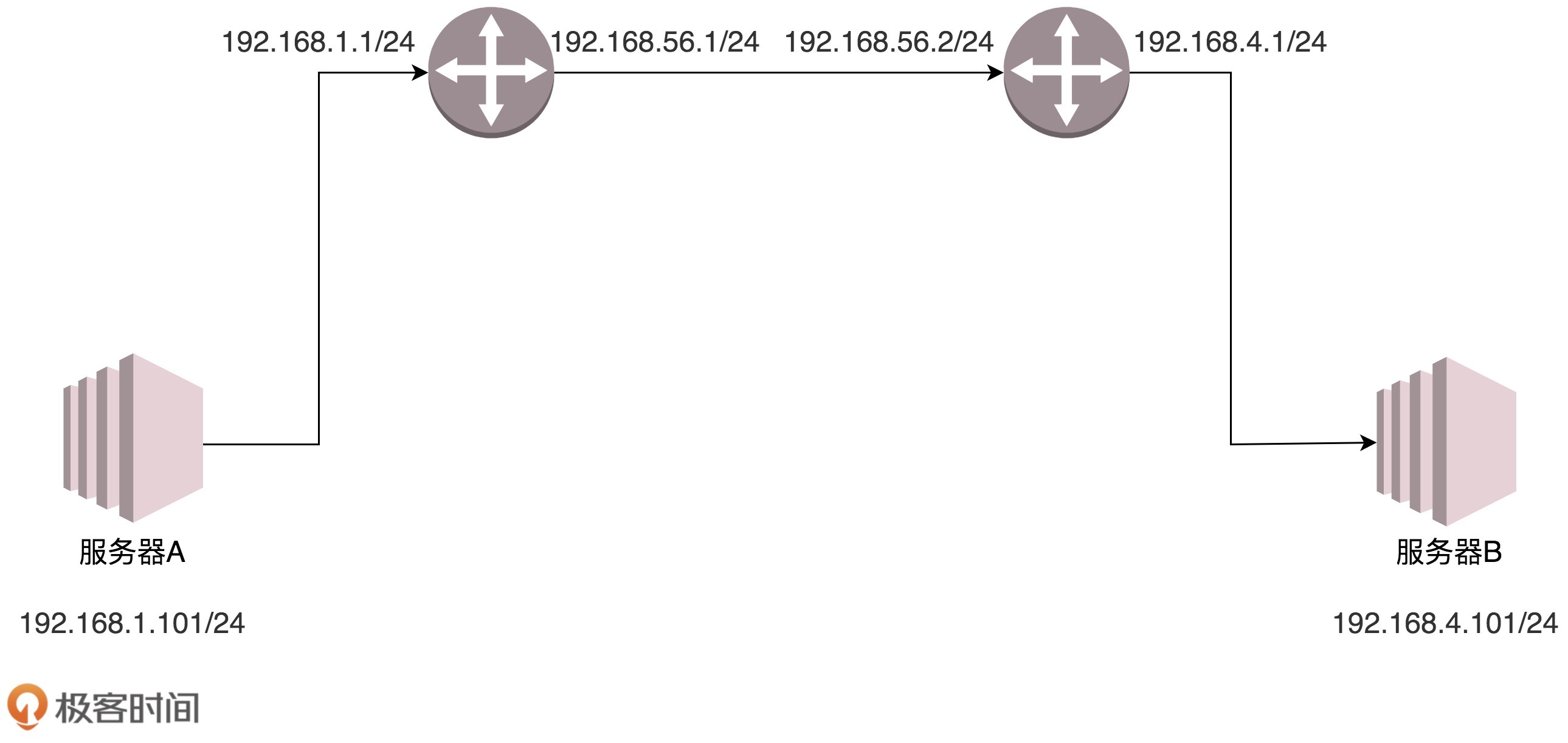 于是,路由器A思考的时候,匹配上了这条路由,要从192.168.56.1这个口发出去,发给192.168.56.2,那192.168.56.2的MAC地址是多少呢?路由器A发送ARP获取192.168.56.2的MAC地址,然后发送包。包的内容是这样的: