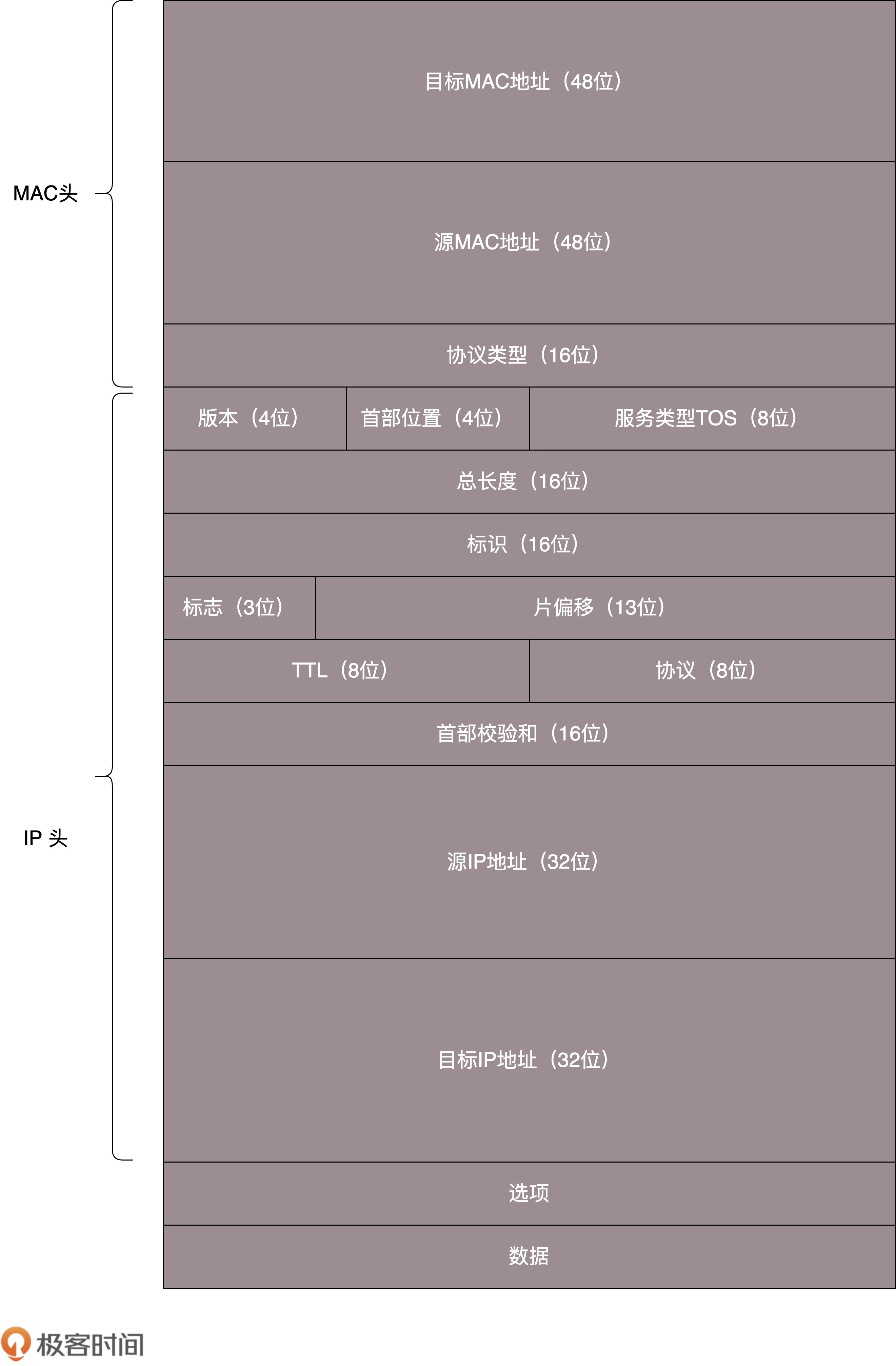 在MAC头里面,先是目标MAC地址,然后是源MAC地址,然后有一个协议类型,用来说明里面是IP协议。IP头里面的版本号,目前主流的还是IPv4,服务类型TOS在第三节讲ip addr命令的时候讲过,TTL在第7节讲ICMP协议的时候讲过。另外,还有8位标识协议。这里到了下一层的协议,也就是,是TCP还是UDP。最重要的就是源IP和目标IP。先是源IP地址,然后是目标IP地址。