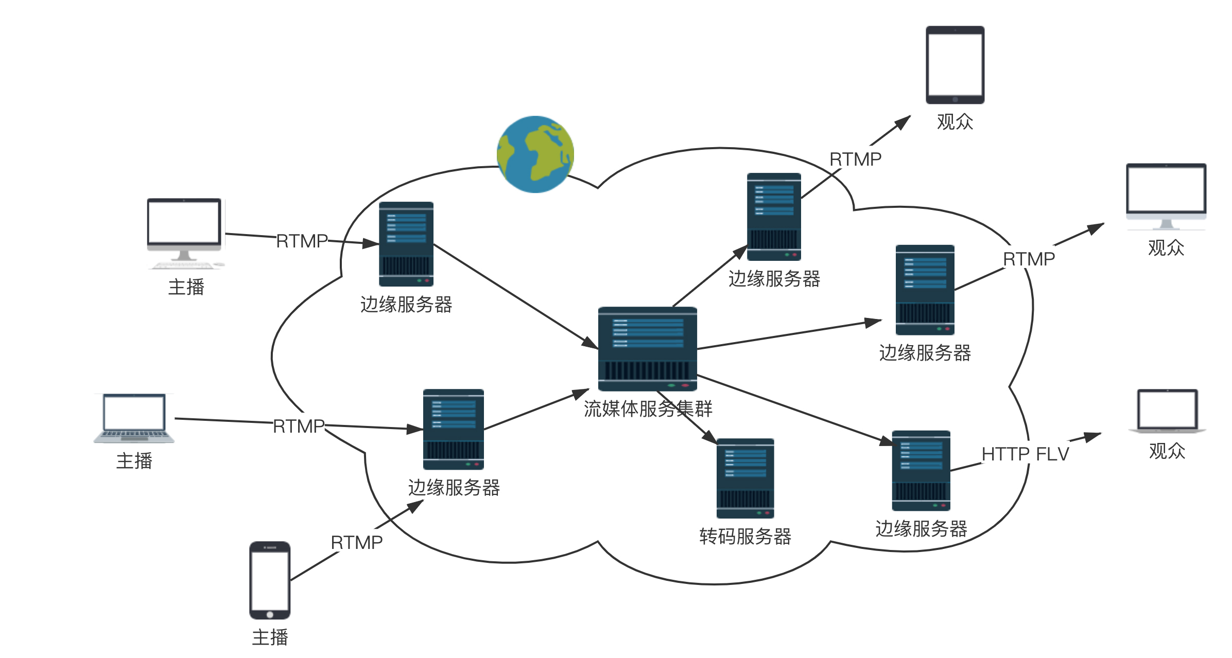 就这样数据就源源不断到达流媒体服务器,整个过程就像这样。