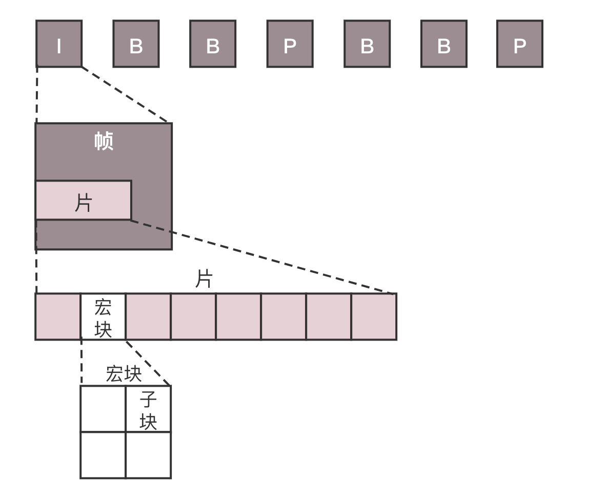 在一帧中,分成多个片,每个片中分成多个宏块,每个宏块分成多个子块,这样将一张大的图分解成一个个小块,可以方便进行空间上的编码。