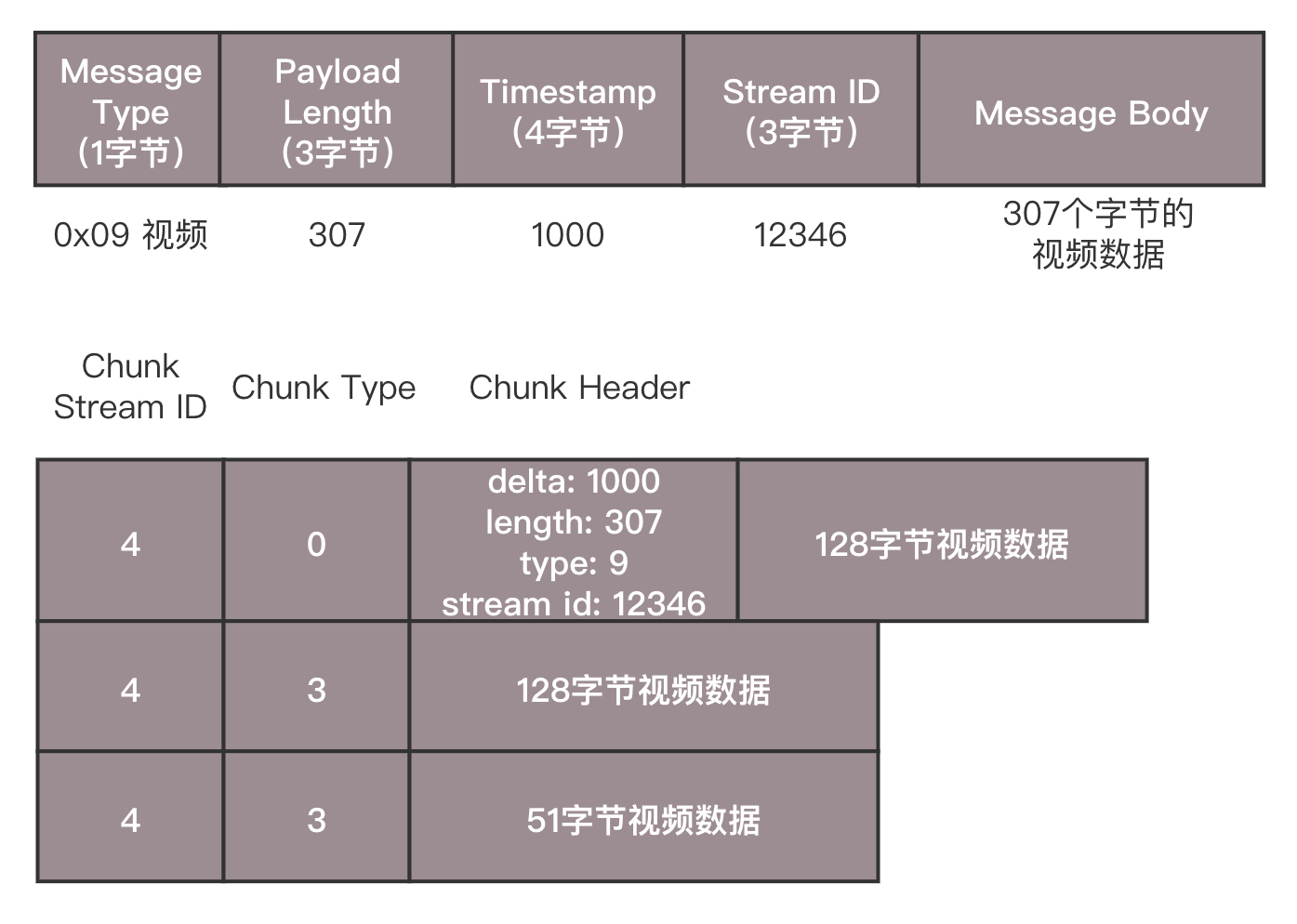 假设一个视频的消息长度为307,但是Chunk大小约定为128,于是会拆分为三个Chunk。