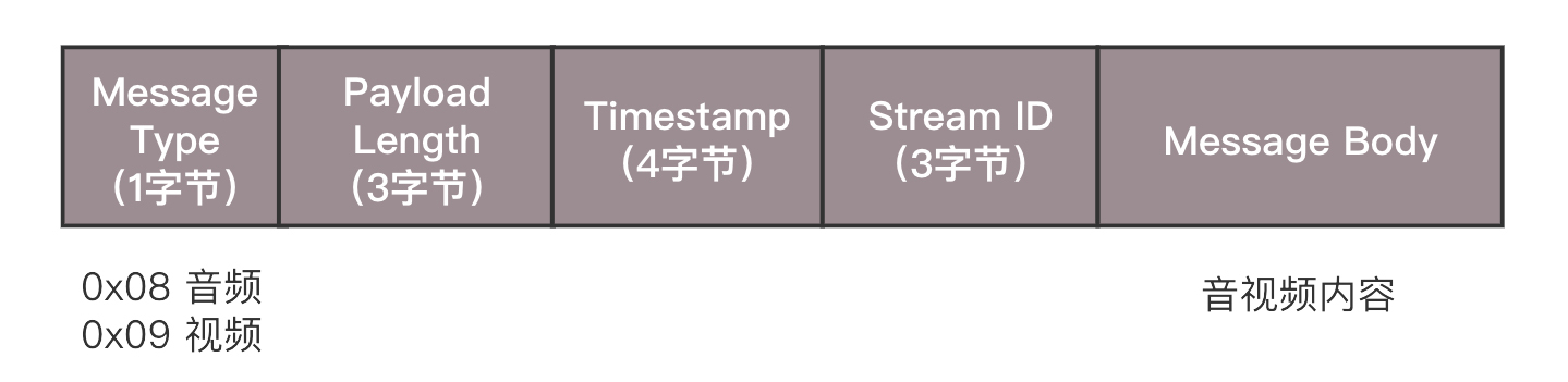 推流的过程,就是将NALU放在Message里面发送,这个也称为RTMP Packet包。Message的格式就像这样。