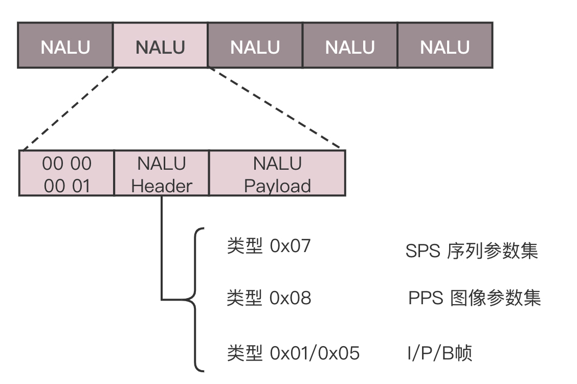 每一个NALU首先是一个起始标识符,用于标识NALU之间的间隔;然后是NALU的头,里面主要配置了NALU的类型;最终Payload里面是NALU承载的数据。