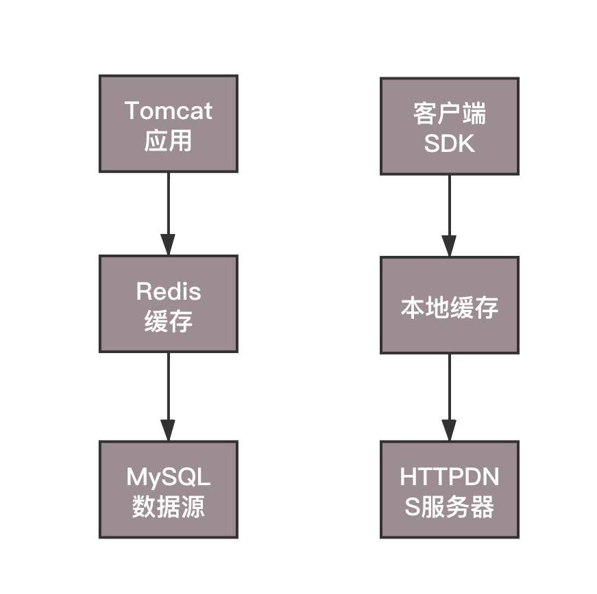 而HttpDNS就是将解析速度和更新速度全部掌控在自己手中。一方面,解析的过程,不需要本地DNS服务递归的调用一大圈,一个HTTP的请求直接搞定,要实时更新的时候,马上就能起作用;另一方面为了提高解析速度,本地也有缓存,缓存是在客户端SDK维护的,过期时间、更新时间,都可以自己控制。