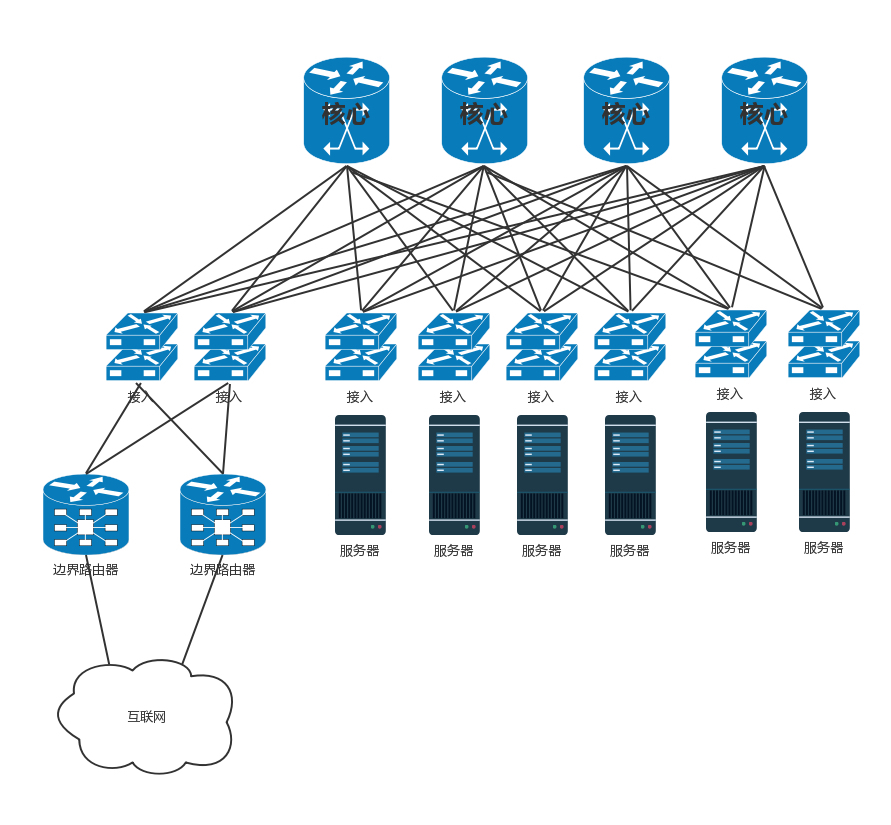 核心交换机吞吐量更大,高可用要求更高,肯定需要堆叠,但是往往仅仅堆叠,不足以满足吞吐量,因而还是需要部署多组核心交换机。核心和汇聚交换机之间为了高可用,也是全互连模式的。