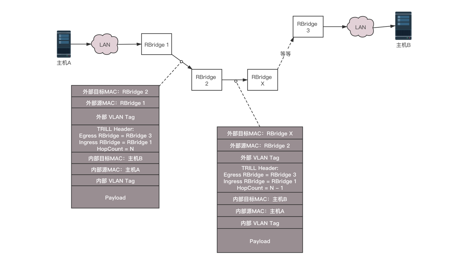 运行TRILL协议的交换机称为RBridge,是具有路由转发特性的网桥设备,只不过这个路由是根据MAC地址来的,不是根据IP来的。