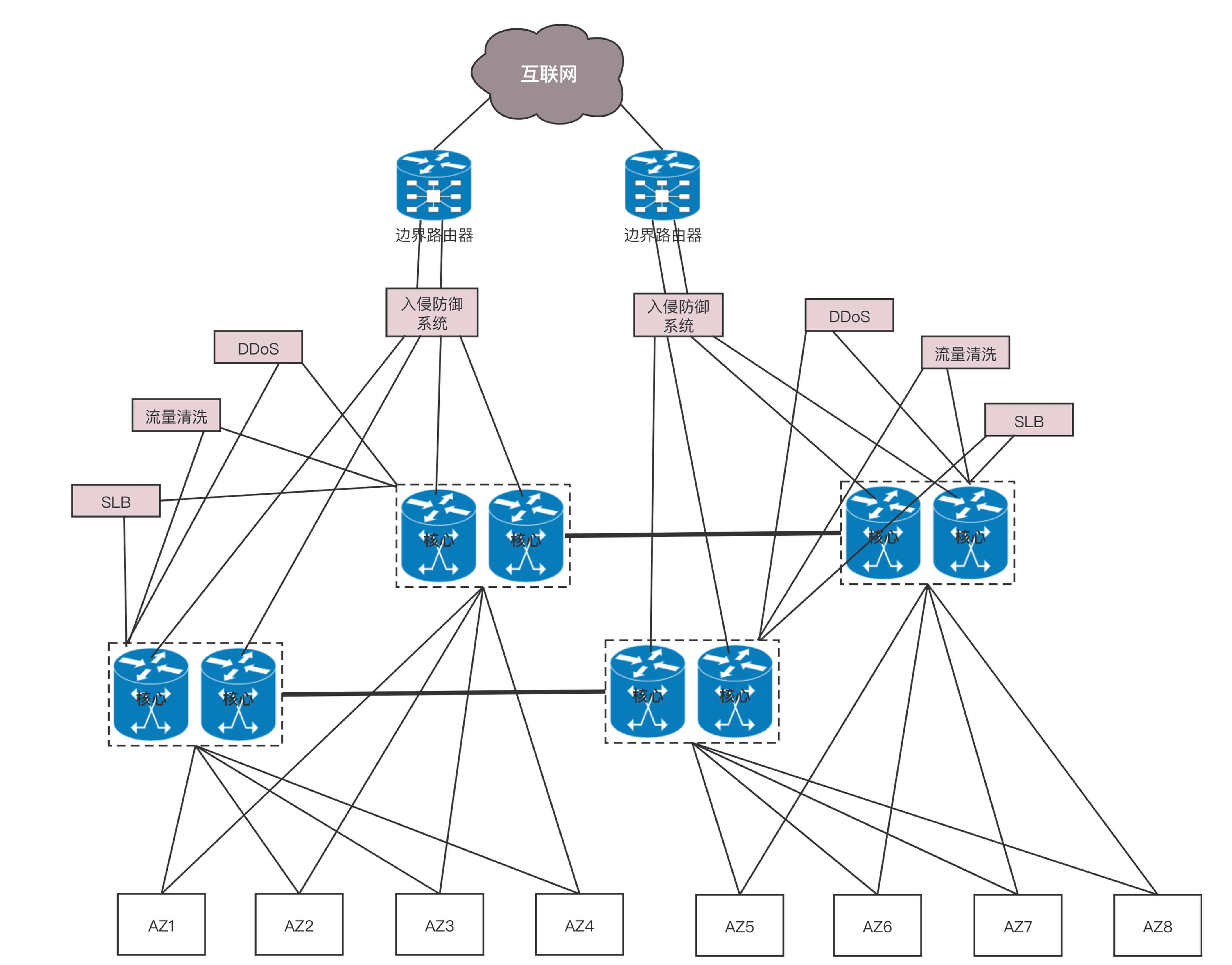 当节点数目再多的时候,一个可用区放不下,需要将多个可用区连在一起,连接多个可用区的交换机称为核心交换机。