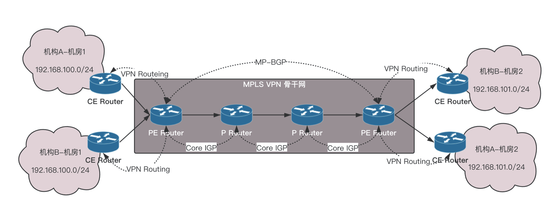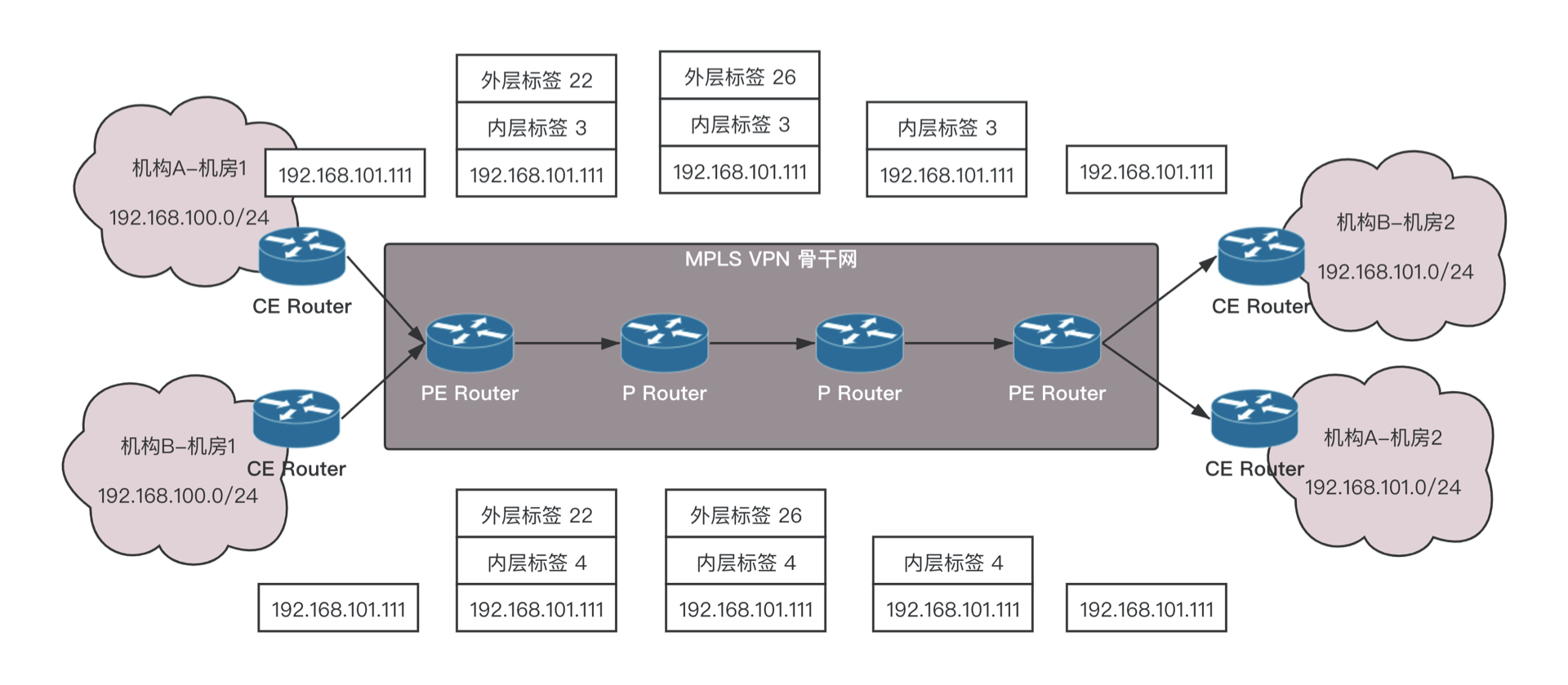 1. 机构A和机构B都发出一个目的地址为192.168.101.0/24的IP报文,分别由各自的CE将报文发送至PE。