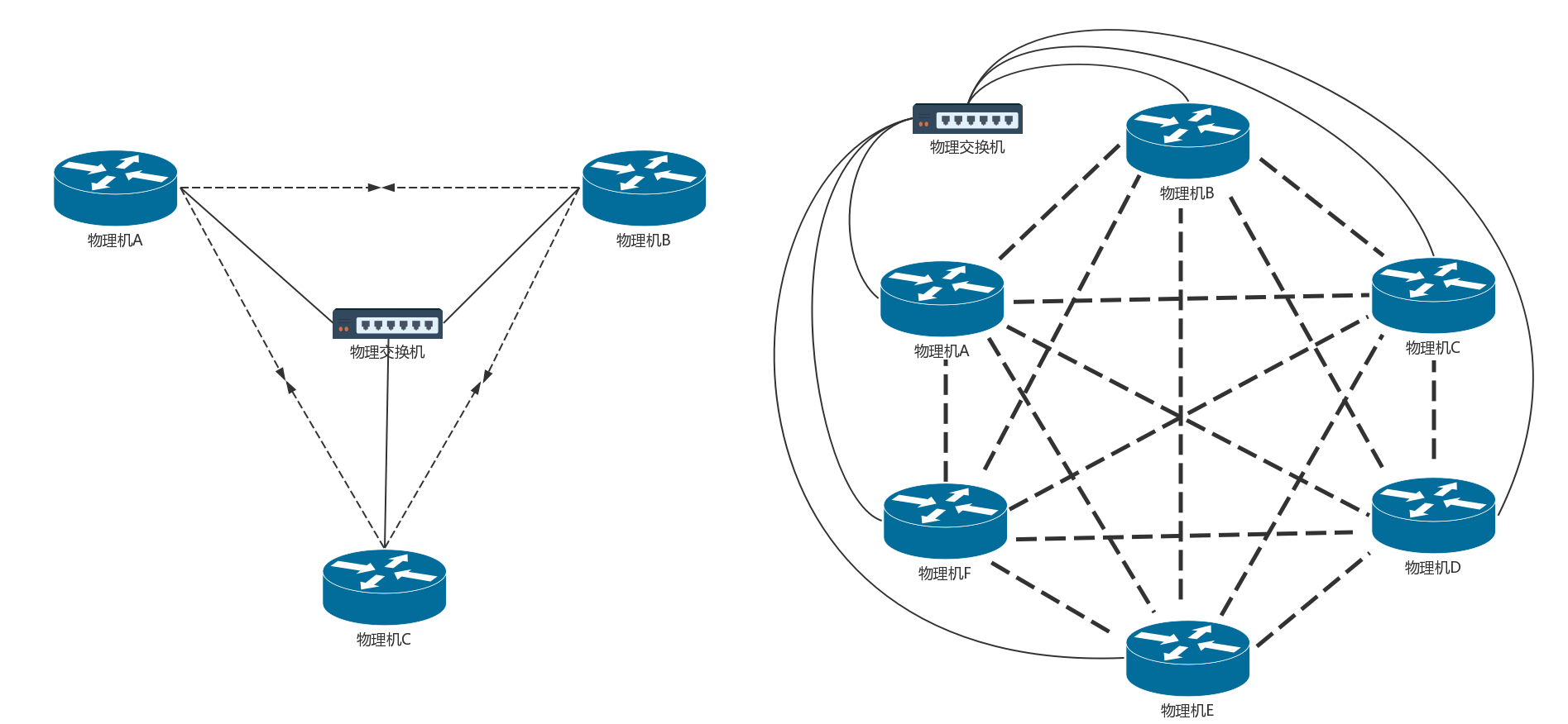 就像图中,有三台物理机,两两之间都需要配置路由,每台物理机上对外的路由就有两条。如果有六台物理机,则每台物理机上对外的路由就有五条。新加入一个节点,需要通知每一台物理机添加一条路由。