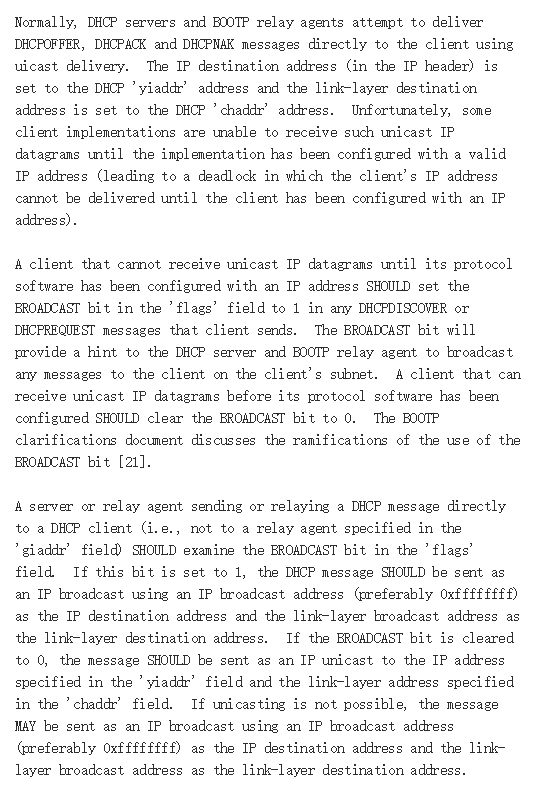 所以,一切取决于客户端的协议栈的能力,如果没配置好IP,就不能接收单播的包,那就将BROADCAST设为1,以广播的形式进行交互。