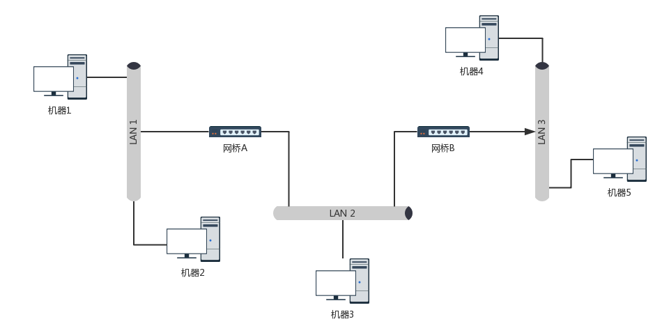 首先,这里的LAN1、LAN2、LAN 3的说法的确不准确,因为通过网桥或者交换机连接,它们还是属于一个LAN,其实这是三个物理网络,通过网桥或者交换机连接起来,形成一个二层的LAN。