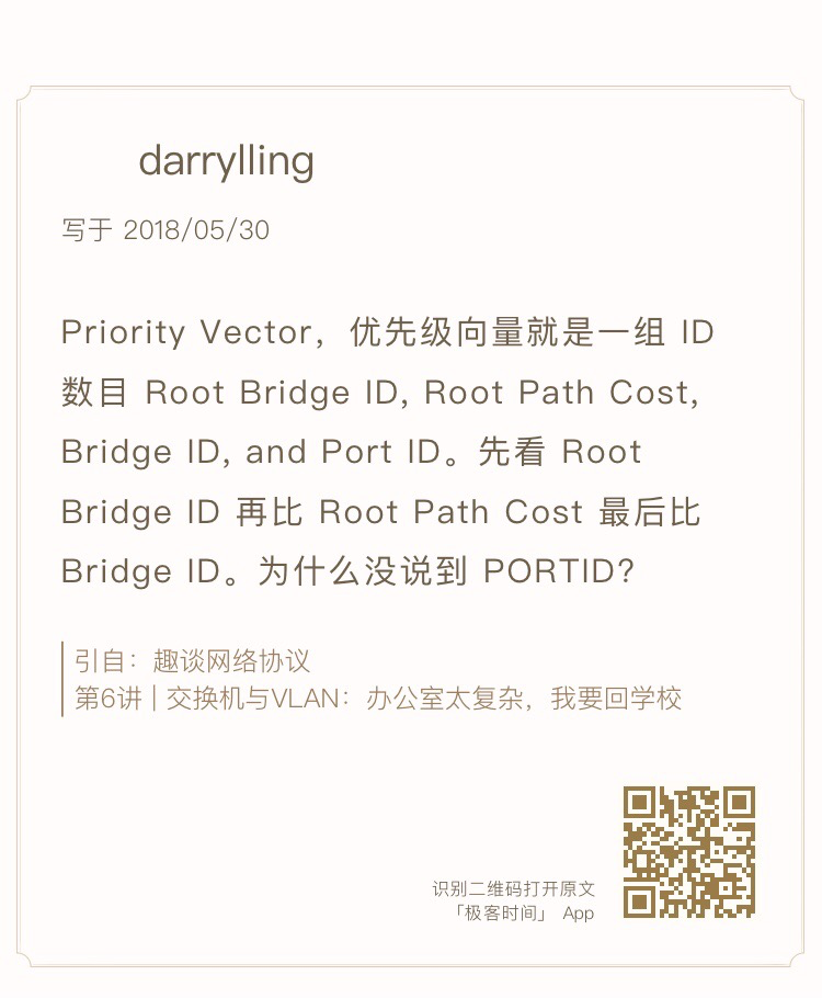 在优先级向量里面,Root Bridge ID就是根网桥的ID,Bridge ID是网桥的ID,Port ID就是一个网桥上有多个端口,端口的ID。