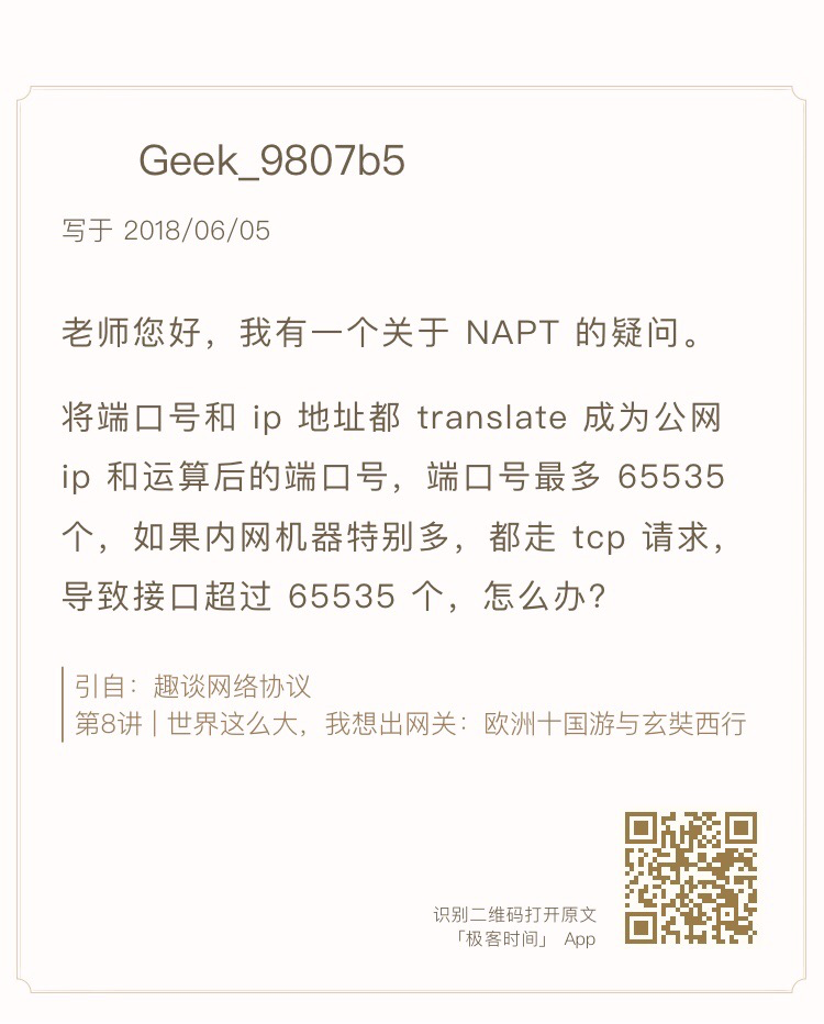 如果内网机器很多,但是访问的是不同的外网,也即目标IP和目标端口很多,这样内网可承载的数量就非常大,可不止65535个。