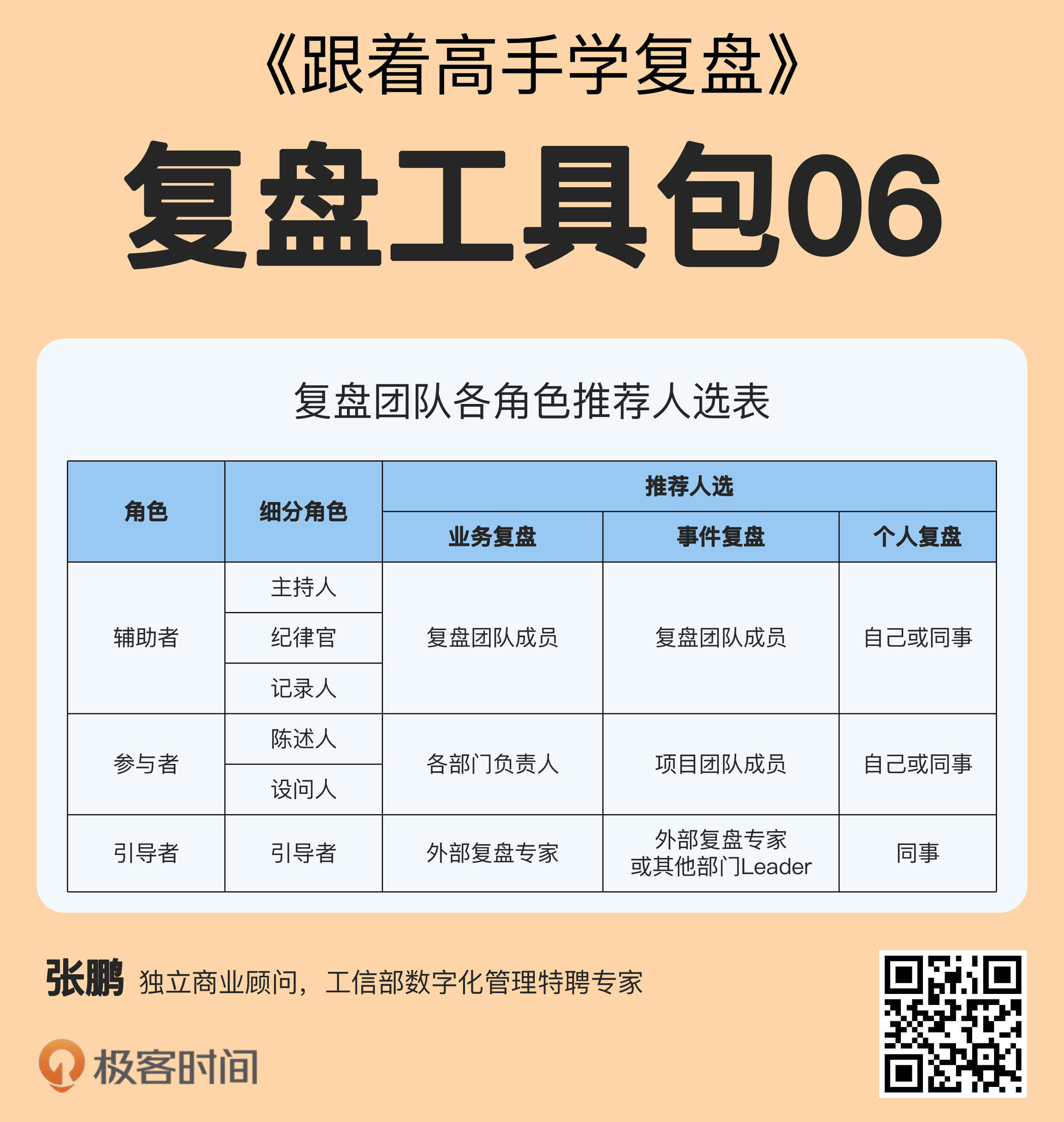 上一讲我讲解了怎么在制度和文化层面营造复盘环境,其中很重要的一个举措就是组建复盘团队,并且做好团队成员的角色分工。这一讲,我将为你介绍具体的方法。