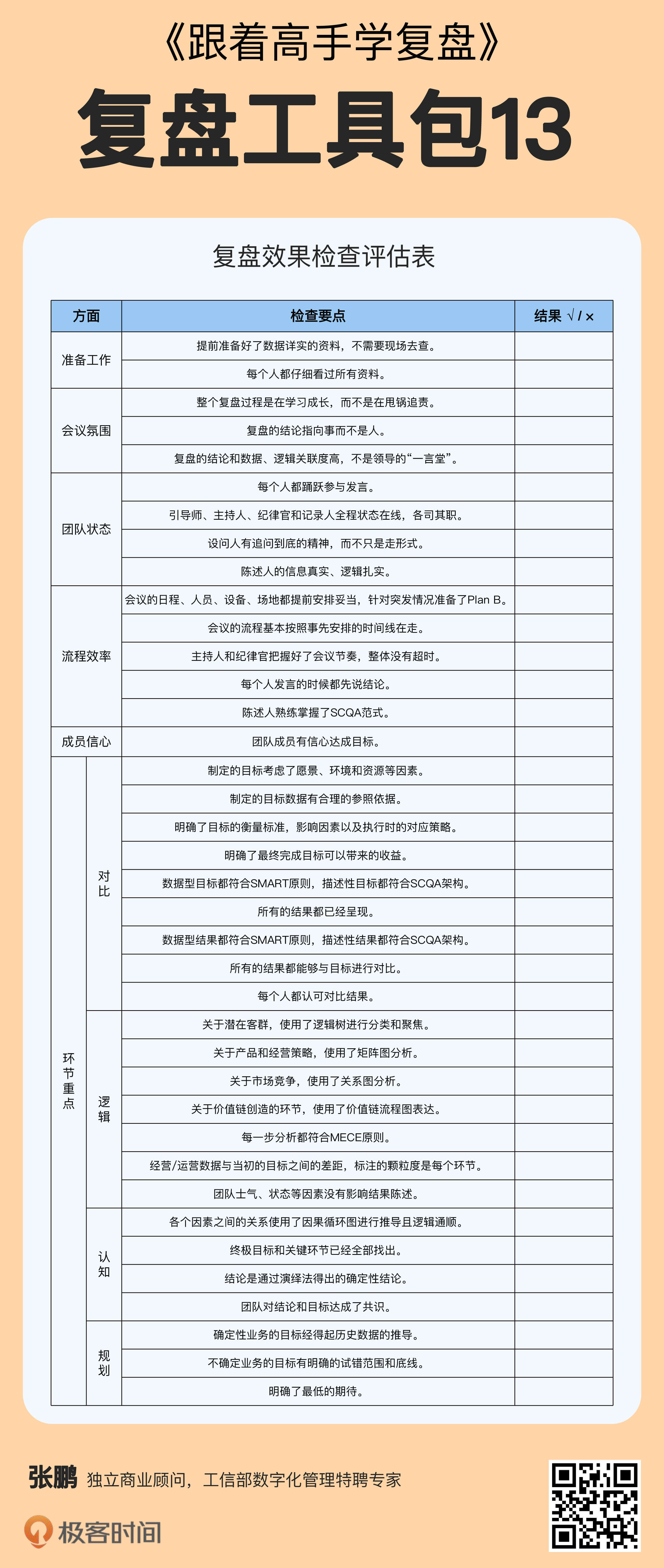 请您根据这一讲学到的知识,对以前参加的某次复盘做一次检查评估,看看效果怎么样。