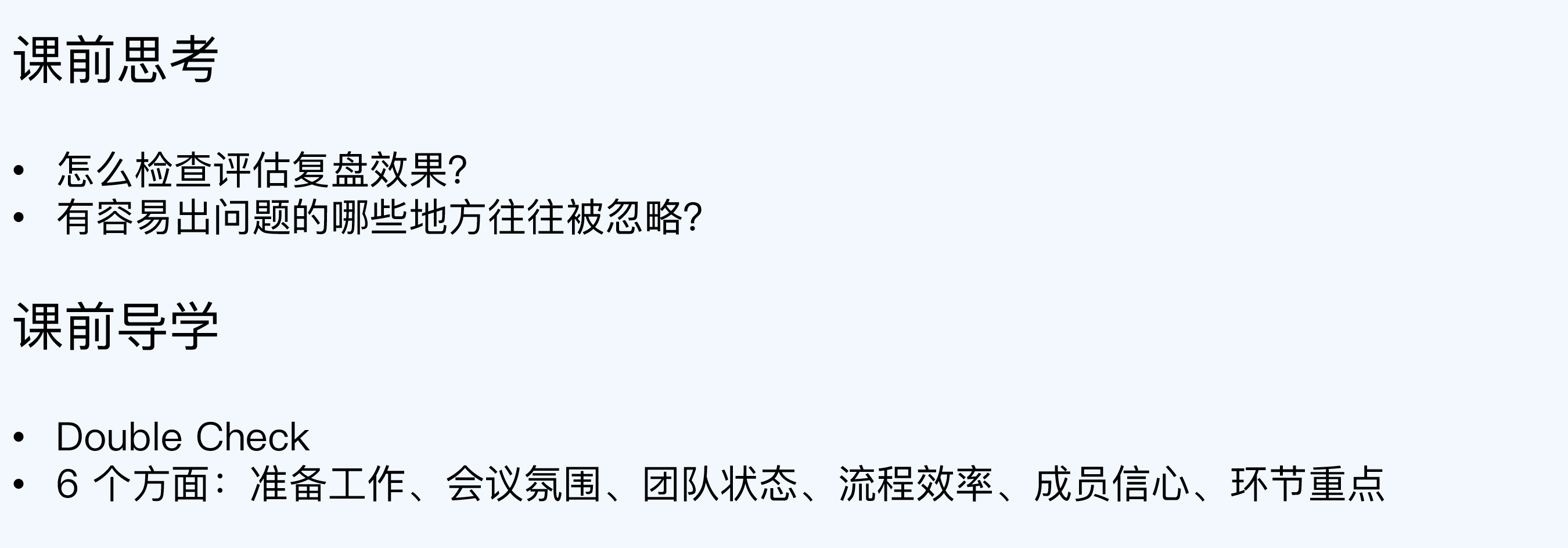 做复盘同样需要Double Check,它的目的在于评估复盘效果,看看复盘过程本身以后有没有需要改进的地方。具体来说,检查评估的内容可以分为准备工作、会议氛围、团队状态、流程效率、成员信心、环节重点这六个方面。这一讲,我就分别介绍一下。