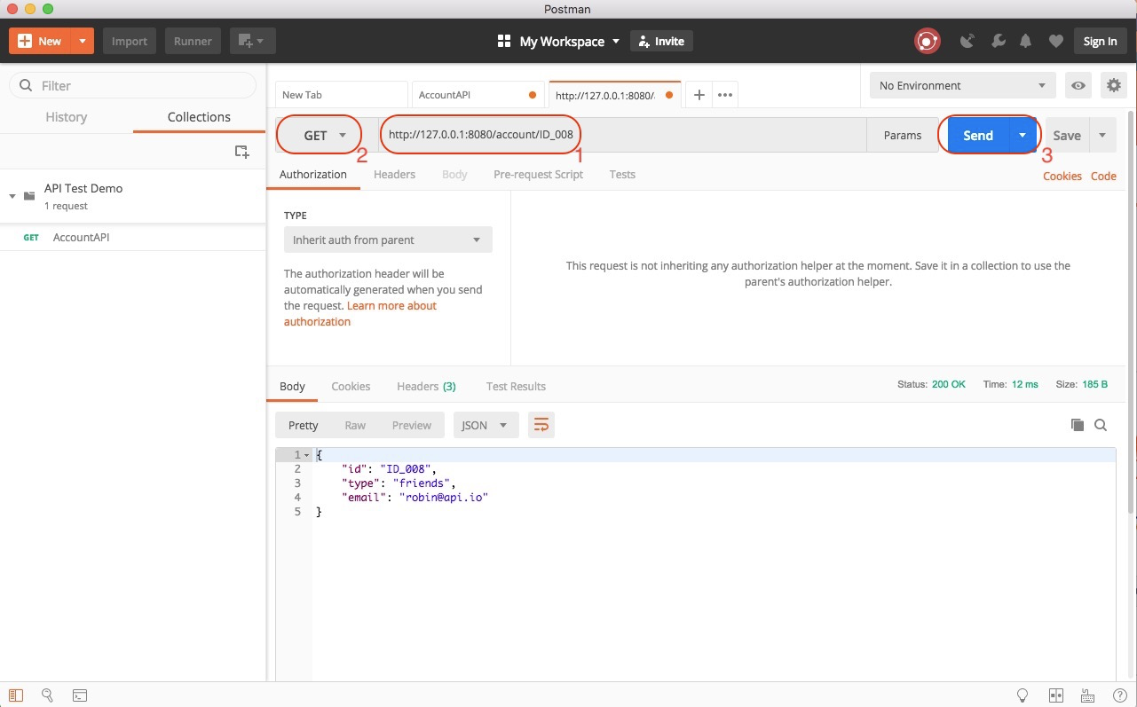 我们的目标是对Account API做测试,所以这里你需要选择Postmant的“Request”模块。进入相应界面后,你需要按照图5的提示依次执行以下三步操作,发起Account API的调用。