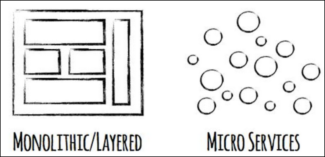 图1就很形象地展示了单体架构和微服务架构之间的差异。