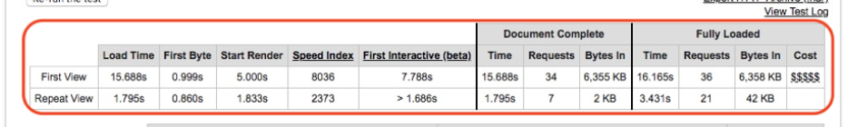本次测试的结果,首次打开页面(First View)花费的时间是999 ms,重复打开页面(Repeat View)花费的时间是860 ms。这两个指标都在1 s以下,所以WebPagetest给出了A级的评分。