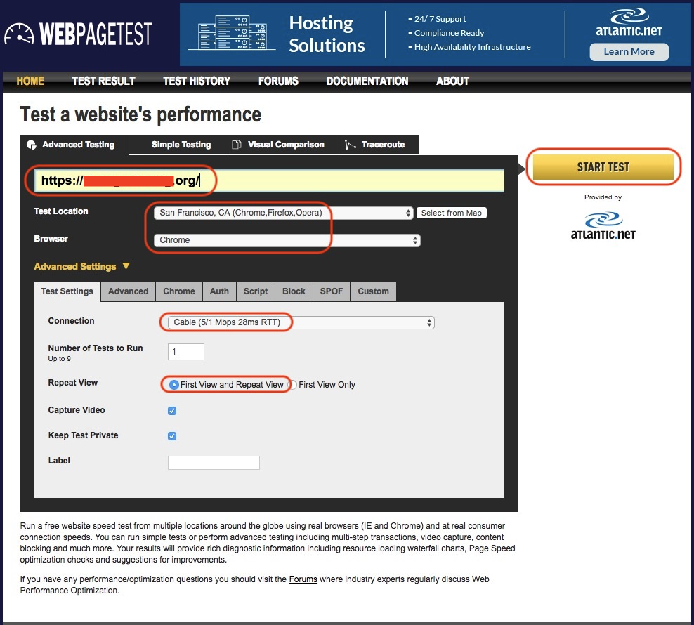 2. 选择测试发起的地域(Test Location)以及你希望使用的浏览器,这里我选择了美国旧金山、Chrome浏览器。