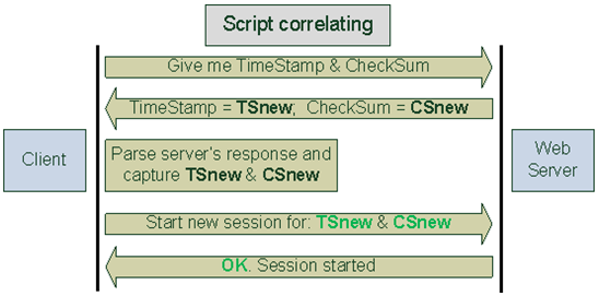 假设,每次客户端连接服务器端时,服务器端都会用当前的时间戳(Time Stamp)计算CheckSum,然后将Time Stamp和CheckSum返回给客户端。然后,客户端就把Time Stamp + CheckSum的组合作为唯一标识客户端的Session ID。录制脚本时,录制得到的一定是硬编码(hardcode)的Time Stamp值和CheckSum值。