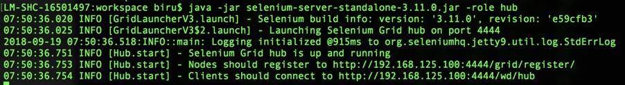 $ docker run -d -p 4444:4444 --net grid --name selenium-hub selenium/hub:3.14.0-europium