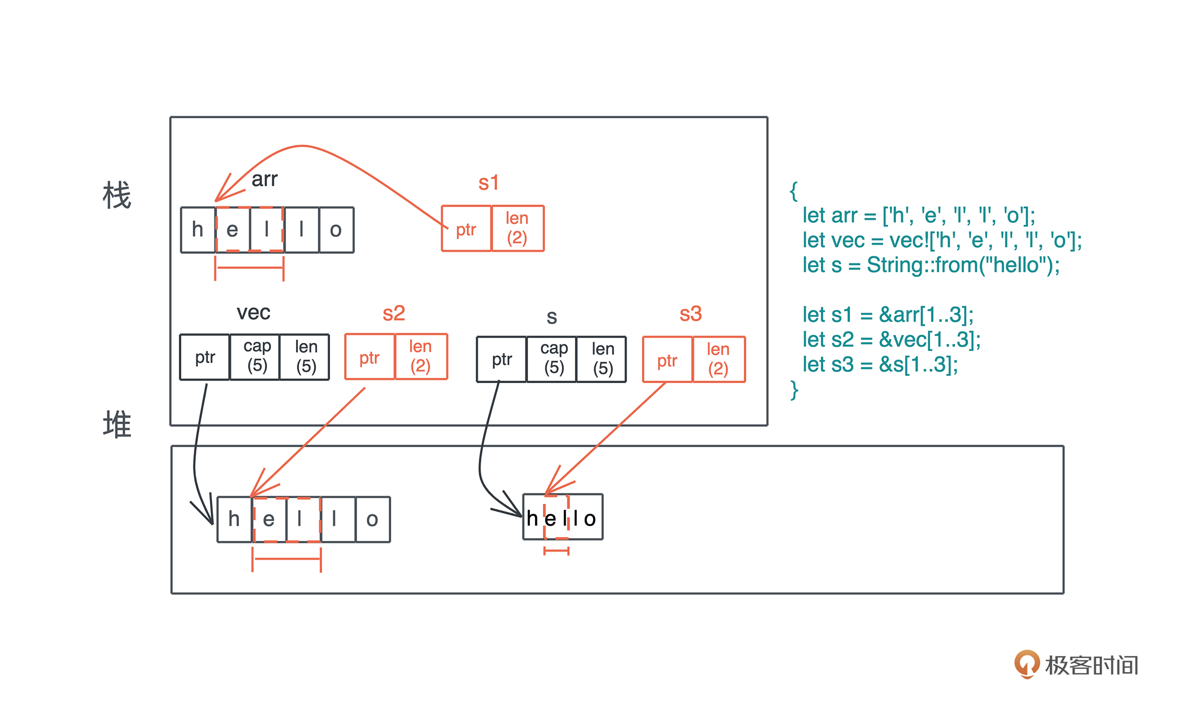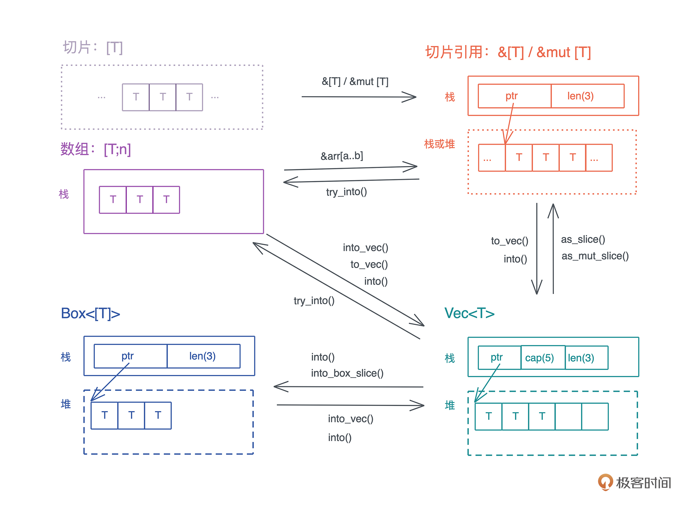 另外在 Rust 下,切片日常中都是使用引用 &[T],所以很多同学容易搞不清楚 &[T] 和 &Vec