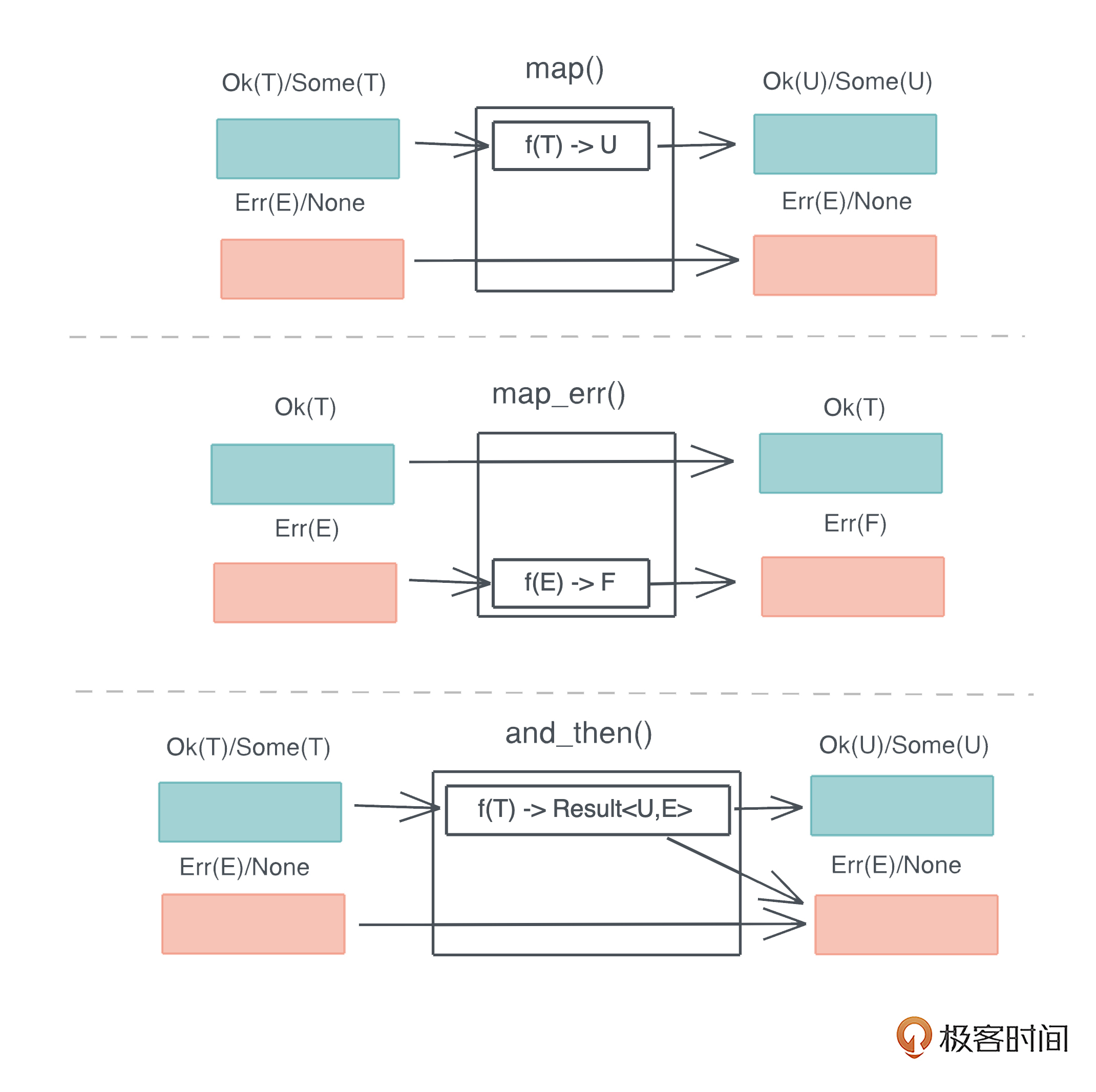 Rust 还为 Option 和 Result 提供了大量的辅助函数,如 map/map_err/and_then,你可以很方便地处理数据结构中部分情况。如下图所示:-