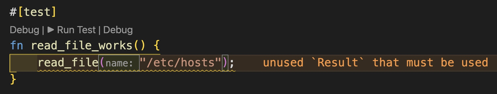 我们看到,Result 类型声明时还有个 must_use 的标注,编译器会对有 must_use 标注的所有类型做特殊处理:如果该类型对应的值没有被显式使用,则会告警。这样,保证错误被妥善处理。如下图所示:-
