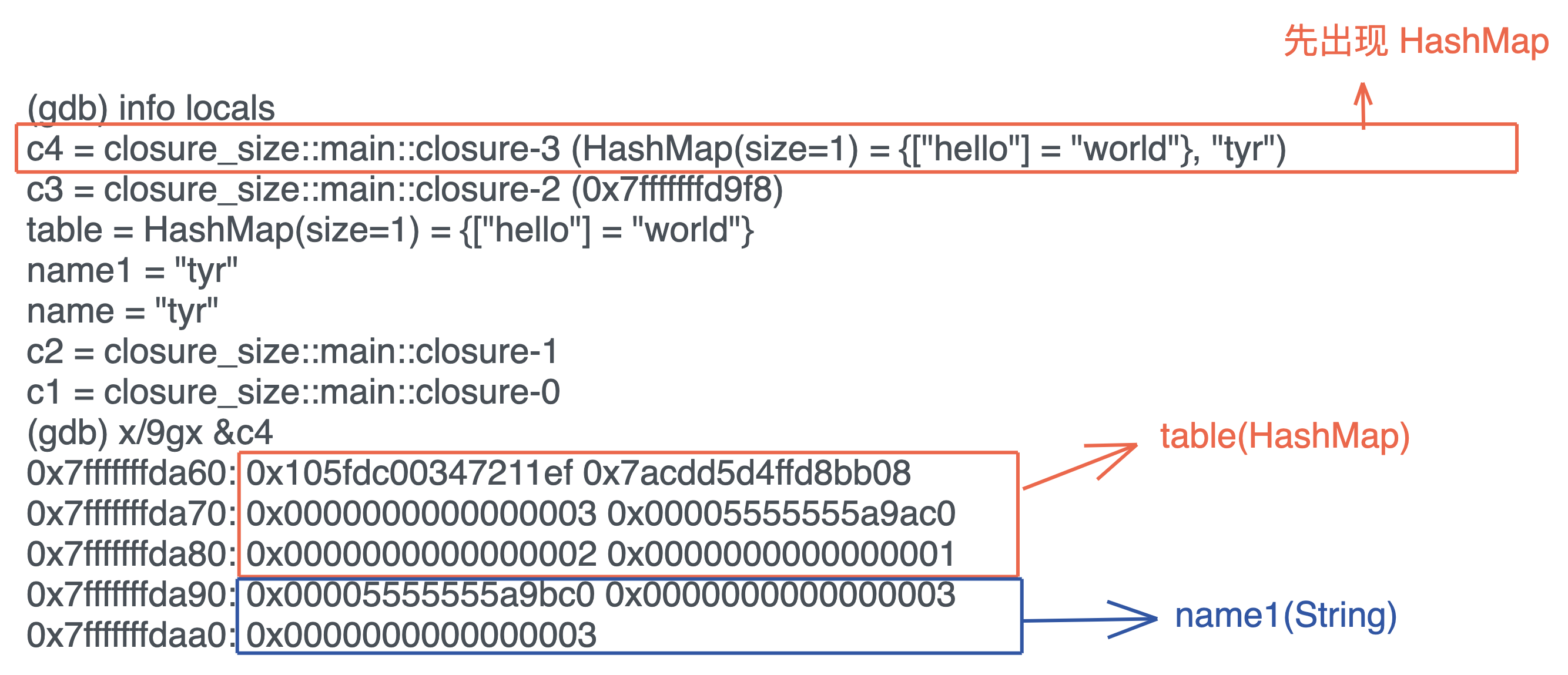 那一个闭包类型在内存中究竟是如何排布的,和结构体有什么区别?我们要再次结合 rust-gdb 探索,看看上面的代码在运行结束前,几个长度不为 0 闭包内存里都放了什么:-