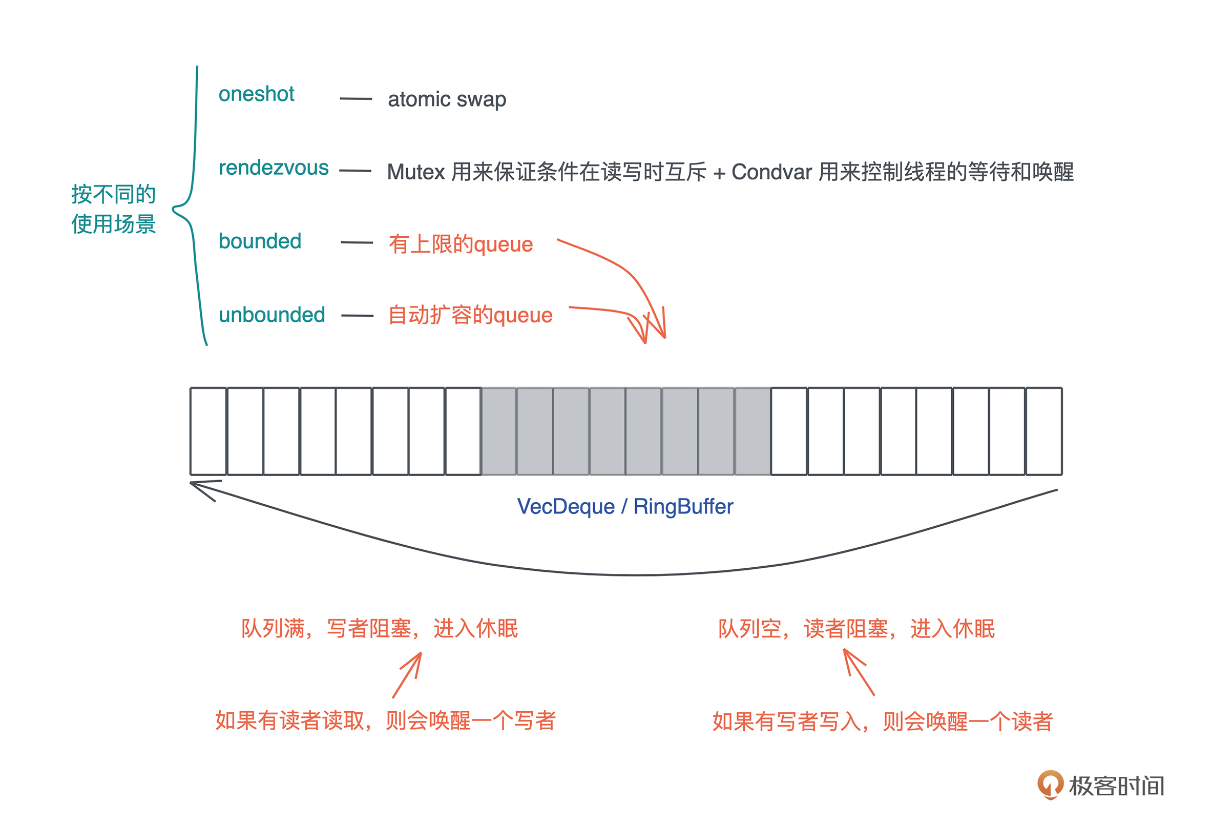notify_one 通知写者,唤醒某个写者使其能够继续写入。因此,实现中,一般会用到 Mutex + Condvar + VecDeque 来实现;如果不用 Condvar,可以直接使用 thread::park + thread::notify 来完成(flume 的做法);如果不用 VecDeque,也可以使用双向链表或者其它的 ring buffer 的实现。