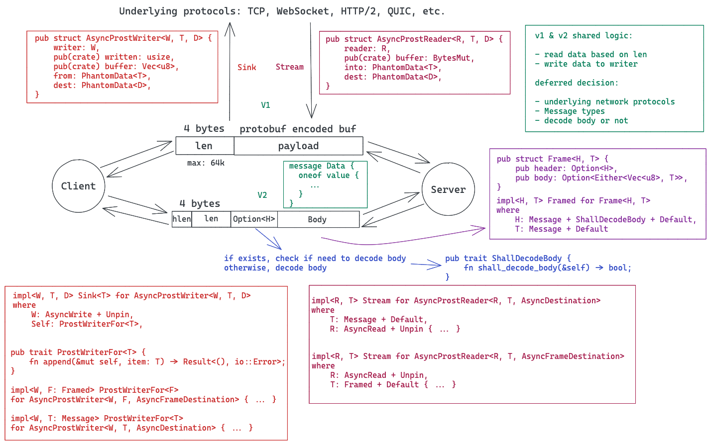 async-prost 是我仿照 Jonhoo 的 async-bincode 做的一个处理 protobuf frame 的库,它可以和各种网络协议适配,包括 TCP/WebSocket/HTTP2 等。由于考虑通用性,它的抽象级别比较高,用了大量的泛型参数,主流程如下图所示:-