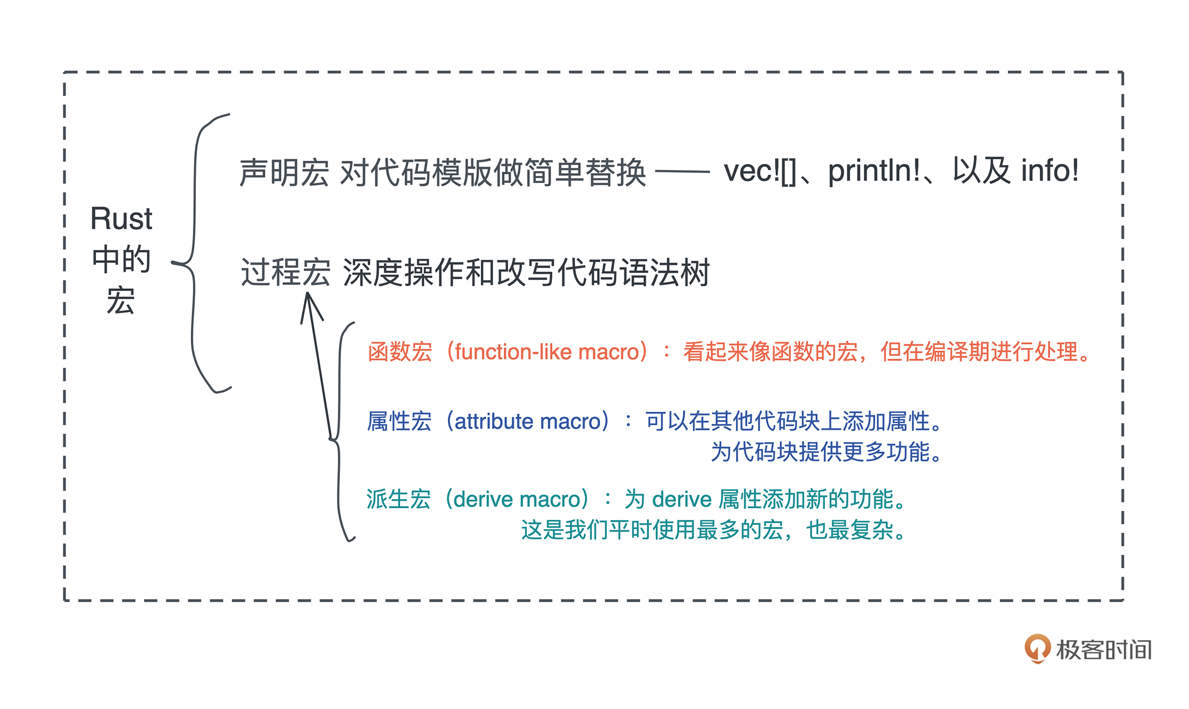 首先是声明宏(declarative macro),课程里出现过的比如像 vec![]、println!、以及 info!,它们都是声明宏。