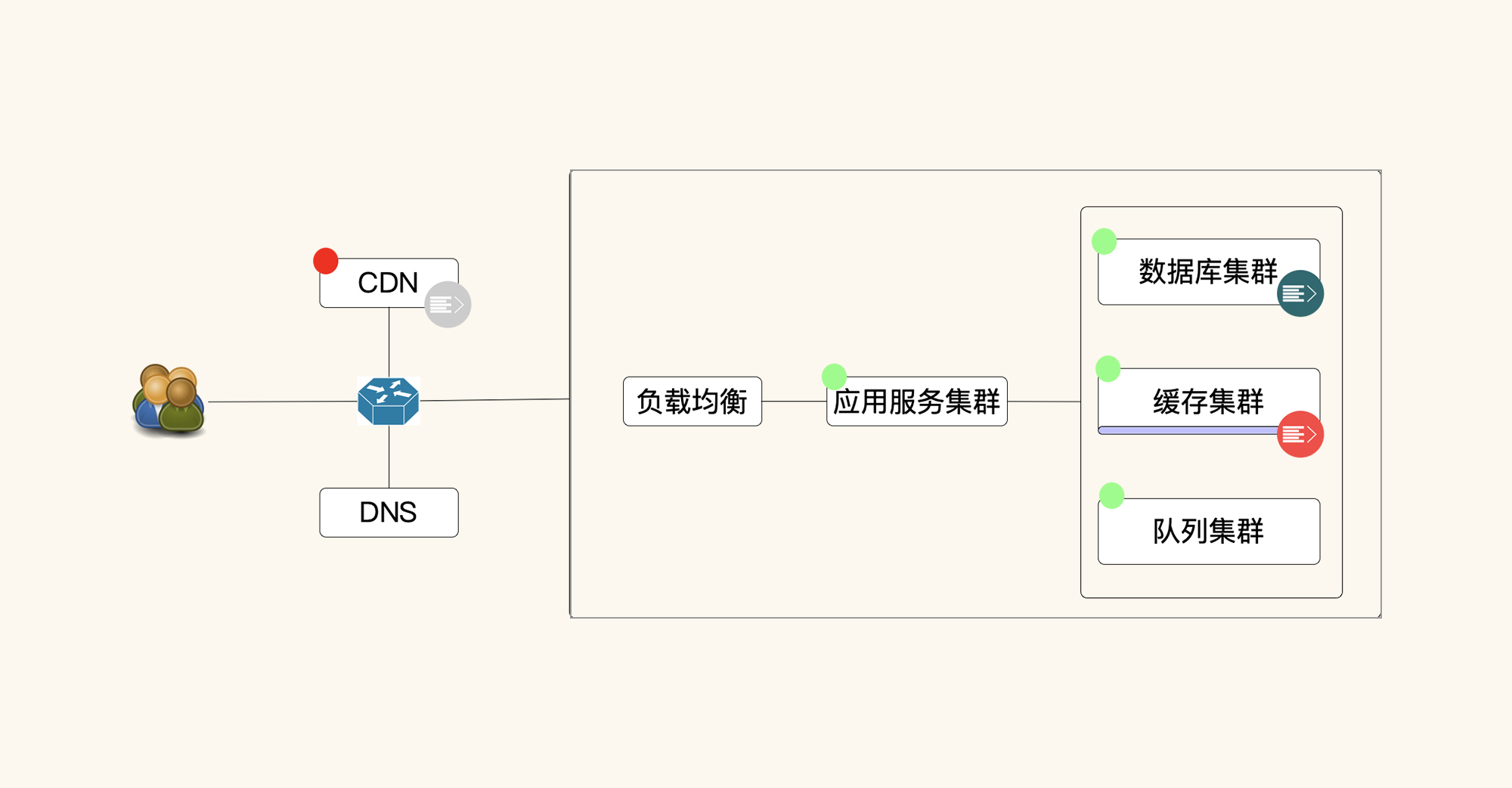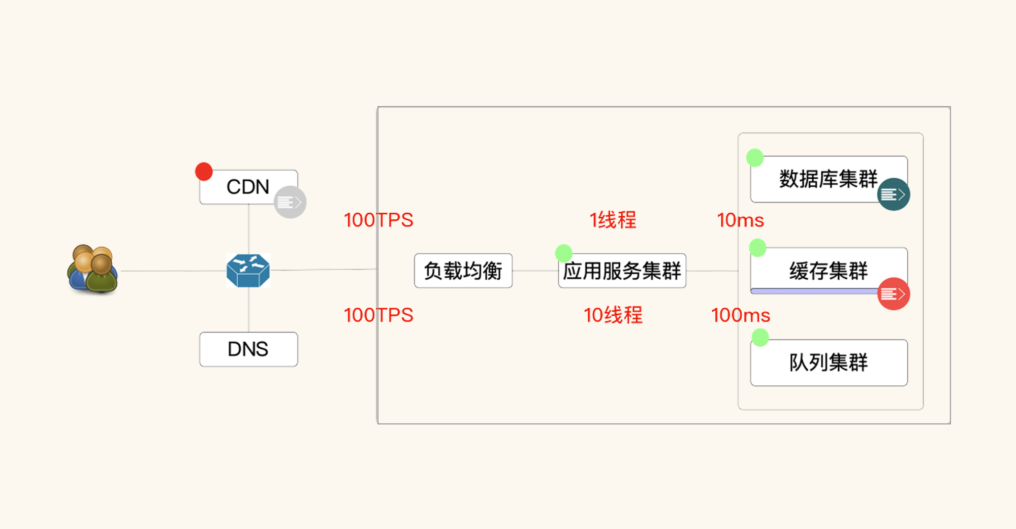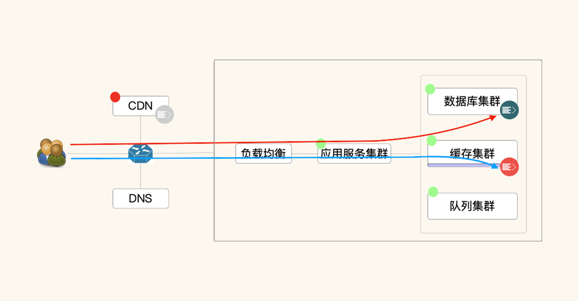 在通常的线上系统架构中,系统中用到的数据分为两部分:静态数据(图中红色点)和动态数据(图中绿色点),这也是我们在性能场景中需要存入的铺底数据。-