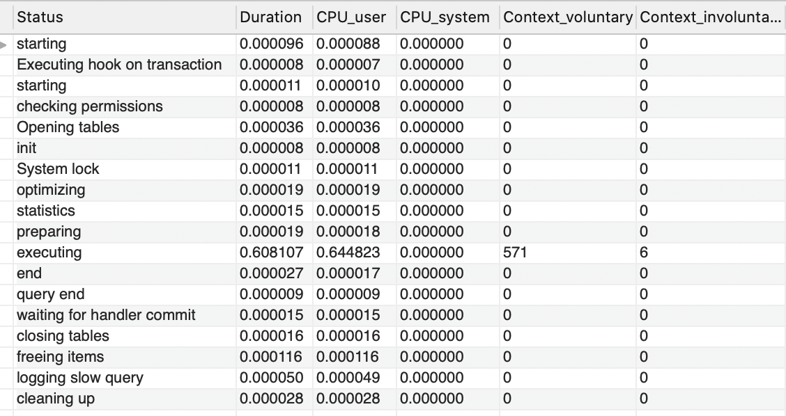 这里我们只需要对比“executing”这一行就能看到明显的差距,它告诉我们当执行这个语句时,需要的CPU时间明显因为数据量的增加而增加了。所以我们不难发现,如果你没有足够的铺底数据放在性能场景中,那一开始便注定了悲剧的结果。