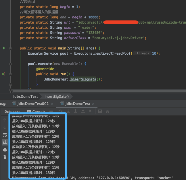 通过上面的代码编写,然后再开启Java线程池与多线程,我们就可以把基础数据快速造完了。下面是造用户地址数据的时间记录(每台电脑配置不一样,用的数据也许会有差异):