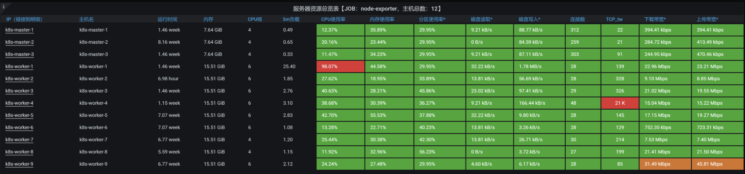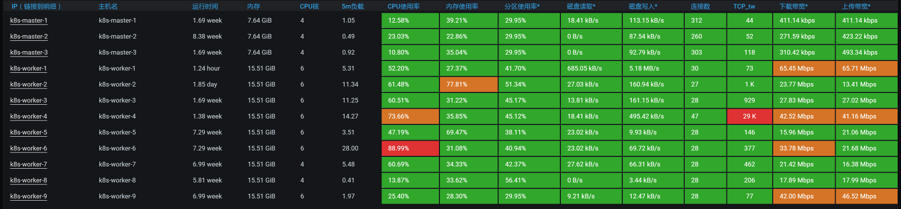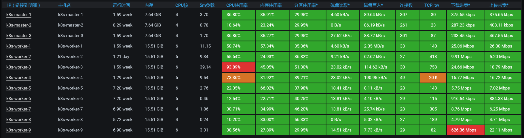 看到全局监控数据的第一个界面,我们就已经可以发现资源消耗比较高的节点了。从数据来看,worker-3的CPU使用率上来了达到了90%以上,worker-4的CPU使用率也上来了达到了70%以上,也就是说TPS会不断地掉下来。下面我带着你来分析一下。