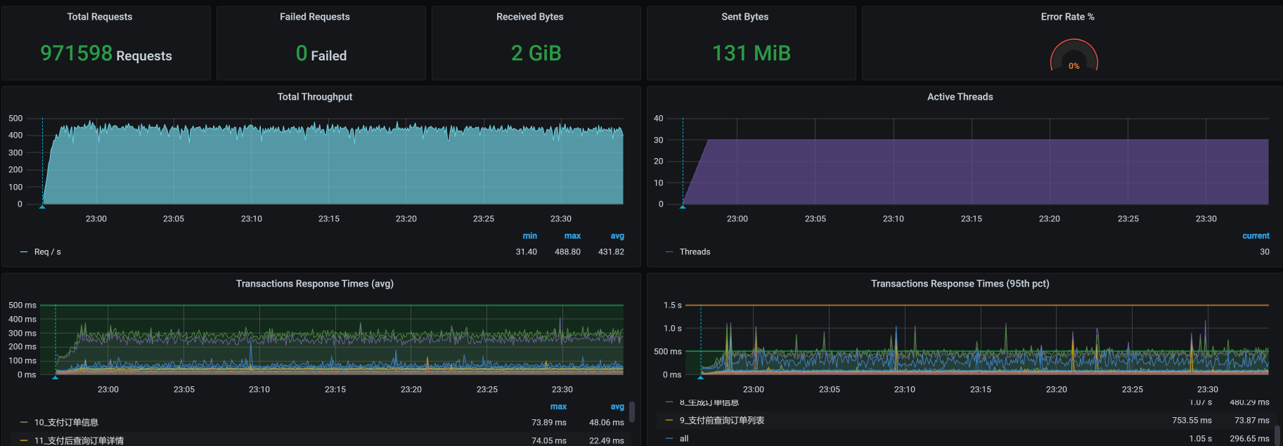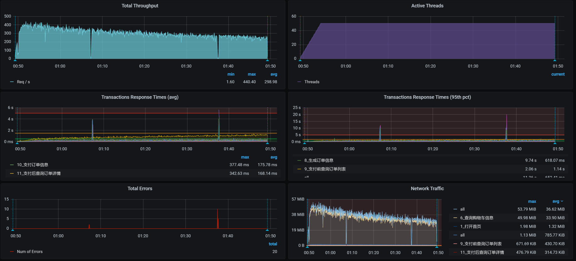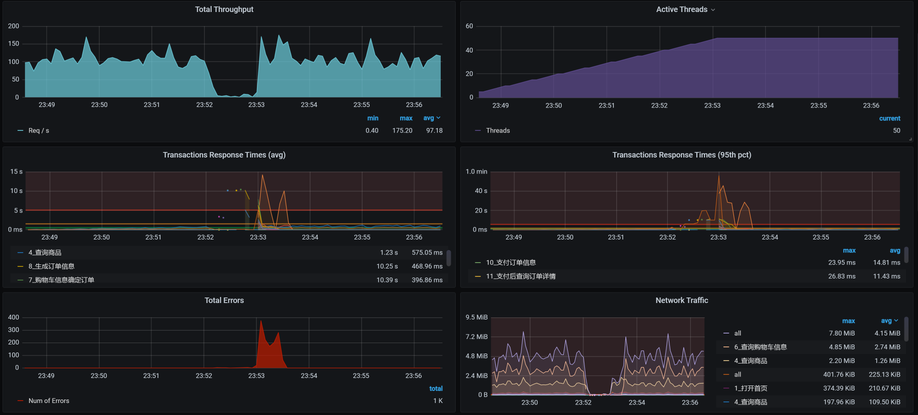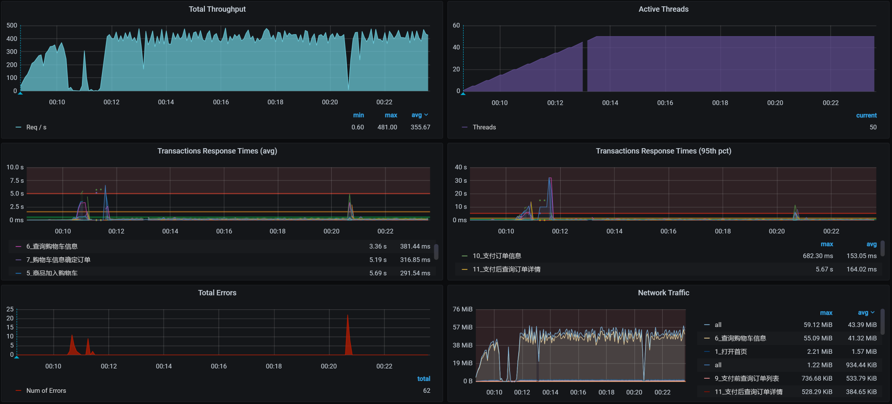 接着我们把容量场景再执行起来,我们得到下面这张全局监控图:
